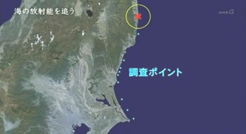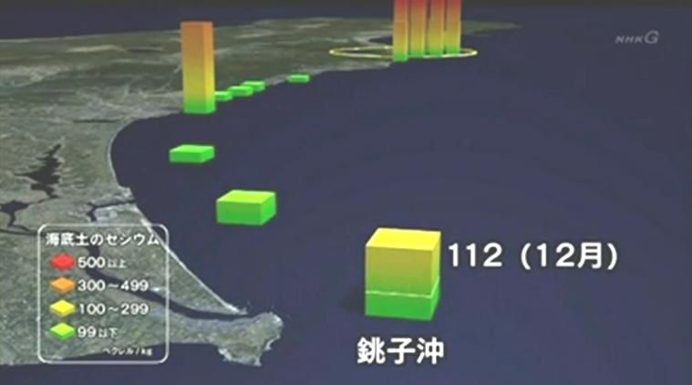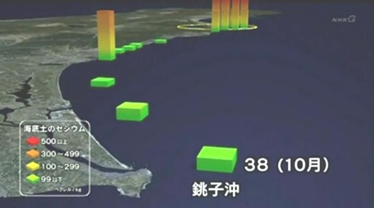 A 180 km, au large de la ville de Choshi de Chiba : 112 Bq/kg au lieu de 38 Bq/kg en octobre 2011A 120 km, au large de Hitachinaka : On pensait que le taux de radioactivité allait baisser, alors que le résultat était étonnant, 380 Bq/kg ! Comme au large de Fukushima. En fait ici, le fond de mer est composé de boues dans lesquelles le césium se fixe facilement.