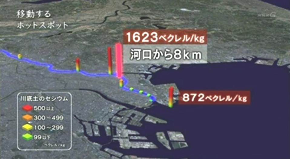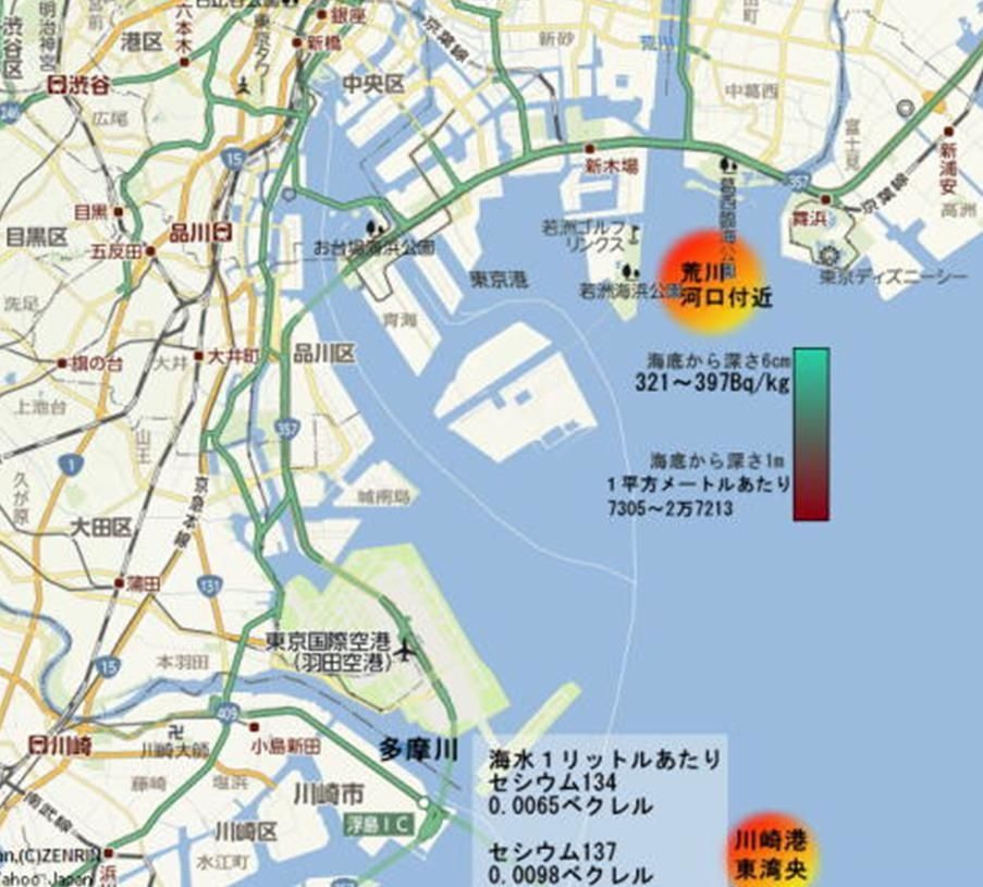 Les taux de césium trouvés étaient peu importants. Ormis au fond de la baie et à l’embouchure de la rivière Edo ( Edogawa) et Arakawa, où il a été relevé jusqu'à 872 Bq/kg !