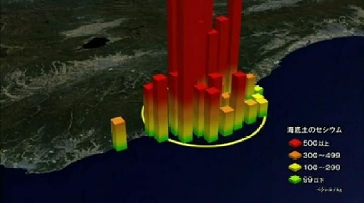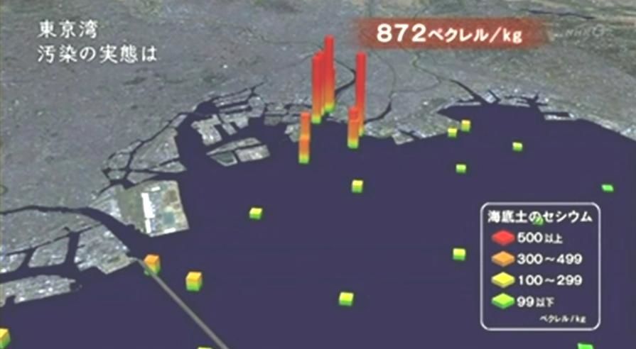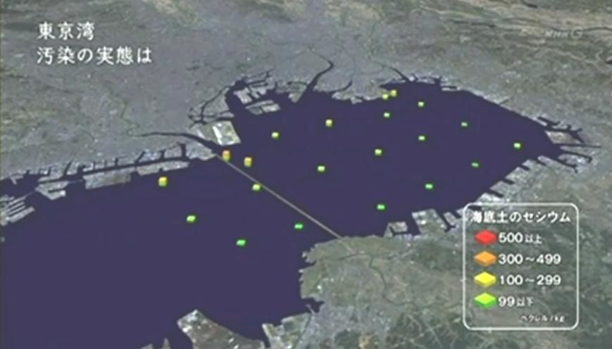 D’après la recherche renouvelée au mois d’avril 2012 par l’équipe du Professeur YAMAZAKI Hideo de l’Université de Kinki dans la Baie de Tokyo, le taux de radioactivité s’est multiplié de 1.5 à 13 fois plus, depuis l’an dernier. C’est à dire ils ont vu la quantité de césium de la terre du fond de la mer à 1m : 7,305-27,213 Bq/m2, au lieu de 0,578-18,242 Bq/m2 en août 2011.