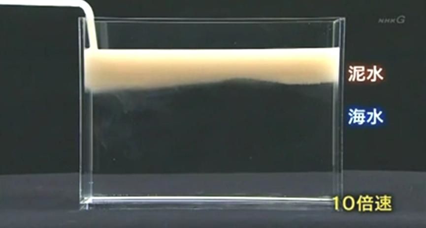 « Ces substances de radioactivité se déplacent dans le courant rapide de la rivière. Mais en approchant à l’embouchure où l’eau douce mélange avec l’eau de mer, l’agrégation se produit : le césium qui se déplacait avec la boue ne se mélange pas tout de suite à l’eau de mer salée. Mais le sel fait coller les boues et le césium se fixe au fond de la rivière.